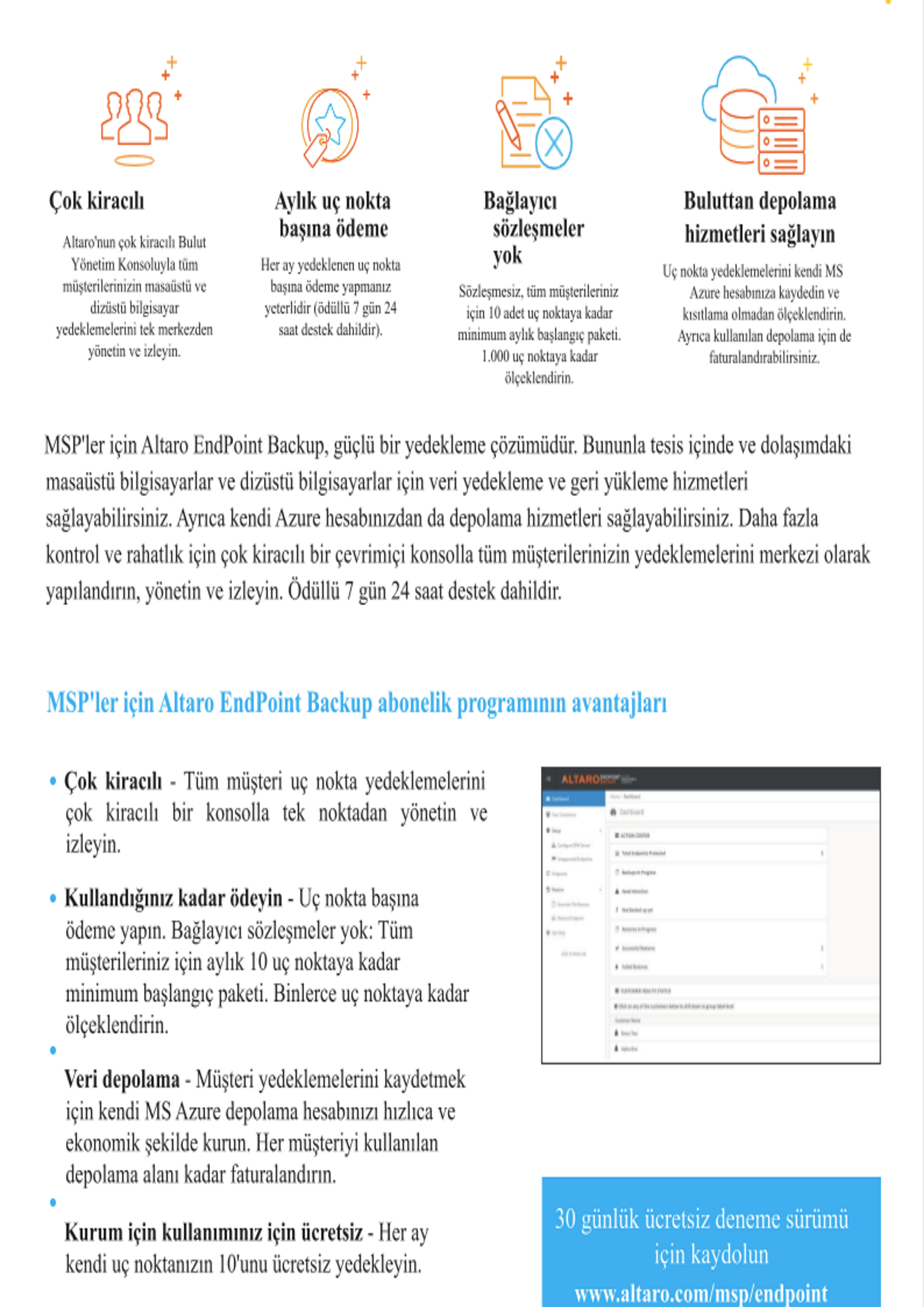 MSP'ler, uç nokta yedeklerini kendi Azure hesaplarına kaydedebilir ve farklı bir gelir akışı olarak kullanılan depolama için faturalandırabilir.